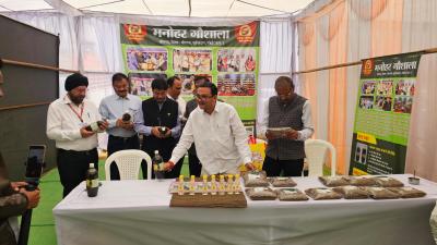 किसान मेले में अखिल जैन ने गौ आधारित कृषि का दिया प्रशिक्षण शिवराज सिंह चौहान को पहनाई गोबर की माला।