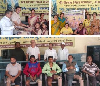 श्री विनय विद्या मंदिर में 150 छात्र छात्राओं को गणवेश, बेल्ट, शूज वितरण, 11 पैर कटे दिव्यांगों को जयपुर पैर वितरण।
